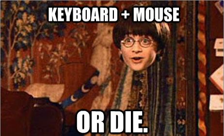 The teacher is currently walking her students through the alphabet and doesn’t notice a piece of chalk floating in midair behind her. Slowly a letter starts to form on the board…K…then another…E…the kids are now wide-eyed and gaping at the board in horror. The teacher notices this and turns around. Scrawled on the board is the phrase “Keyboard + Mouse or Die”. She screams in terror and runs out of the room, uttering the phrase over and over again…Keyboard + Mouse or Die. Keyboard + Mouse or Die.