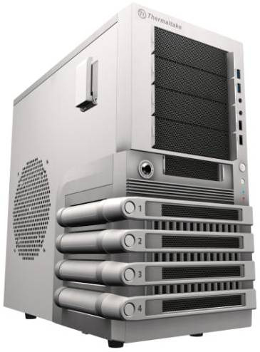 This is the new Armor Revo full tower chassis. It has massive feet and a ton of enthusiast grade features. It has an aluminum front, a hot swap docking station, liquid cooling support, USB 3.0 ports and can house five system fans. A headset holder is built into the side of the case. Thermaltake started the headset holder trend for gamers, and this a welcome feature.