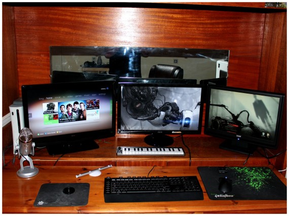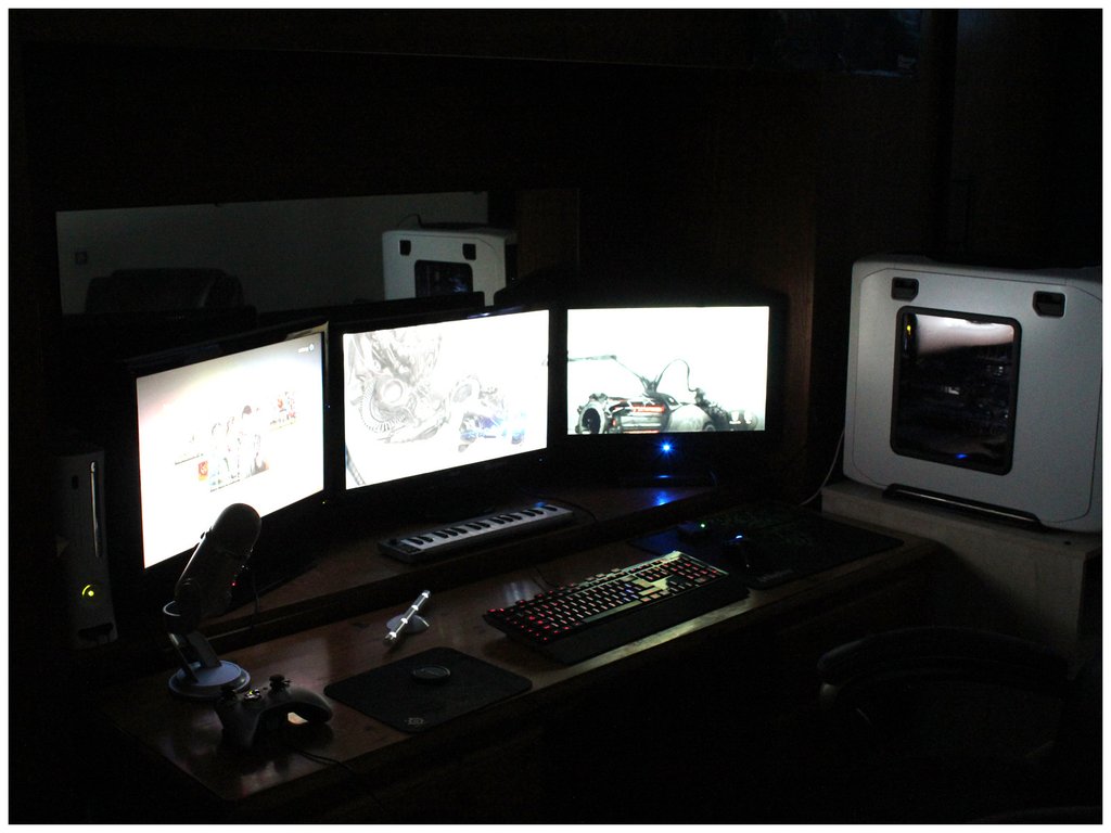 I have 2 screens set up. One is a 24″ Asus LED and the other is a crappy old DGM 22″. I want to upgrade to a second Asus at some point soon, probably when I get a new graphics card. I still have my Xbox and TV set up (consololol), mainly because I like playing indie games on there and talking to my mates, as well as using Netflix, which just came over here to the UK recently. The mic is a Blue Yeti, and it’s a beast. I use it for music stuff because I play the guitar and ukulele. I also have a little M-Audio MIDI keyboard on there too, just to mess around with.