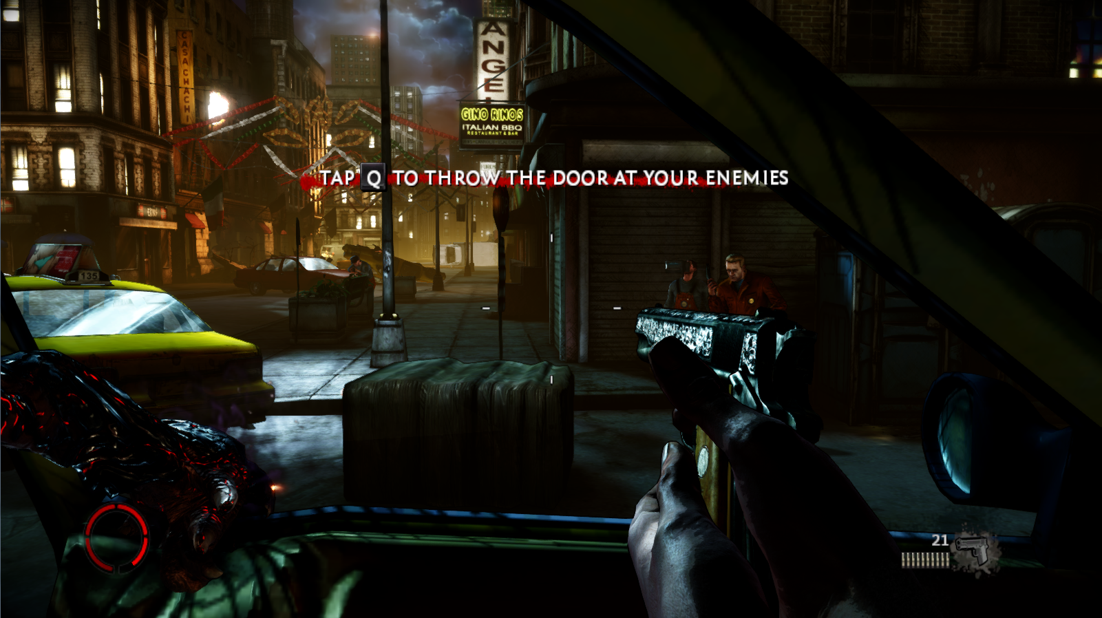 Surrounded by Italian stereotypes so overt that they border on parody, you fill the role of Jackie Estacado. Jackie has risen through the ranks of the mob, securing its highest honor, The Don, using the powers of “The Darkness.” The game opens two years after the original title – a console exclusive. For those of us who had skipped The Darkness, the developer has graciously seen fit to include a “Previously On” option that rapidly brings you up to speed. Jackie is plagued by an ancient force known as “The Darkness” and following the last games events, he has sworn to keep this evil locked away inside him. “The Darkness” is in a constant state of revolt – attempting to escape. After a spectacular beating, Jackie can no longer contain its power. “The Darkness” manifests in Jackie once again to help him track down the unknown assailants. Not only does Jackie have to overcome these outside attacks, he must confront and stop “The Darkness” from taking him over completely.
