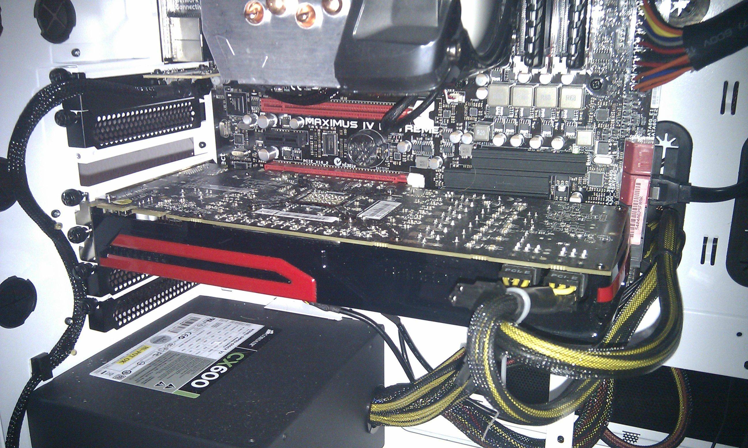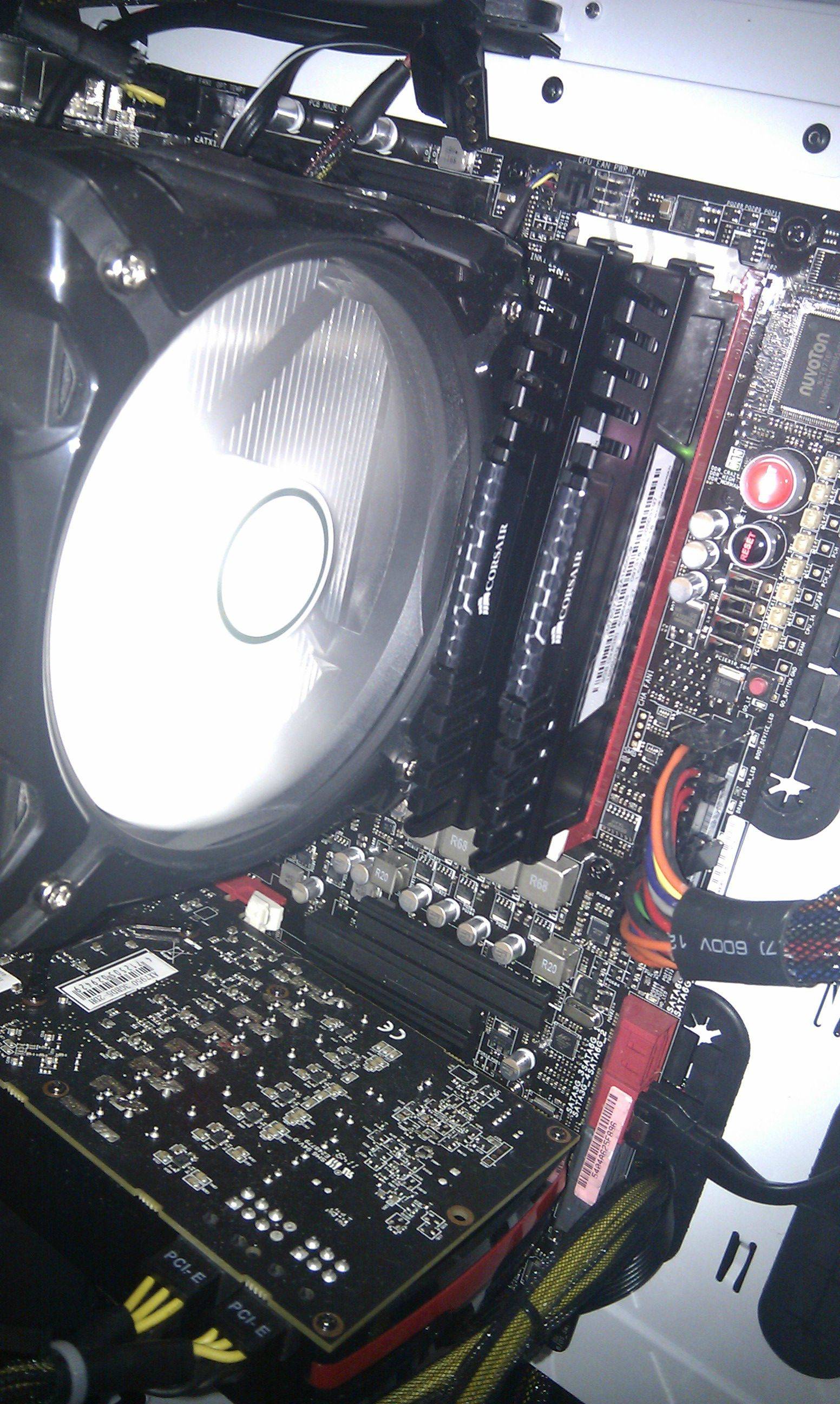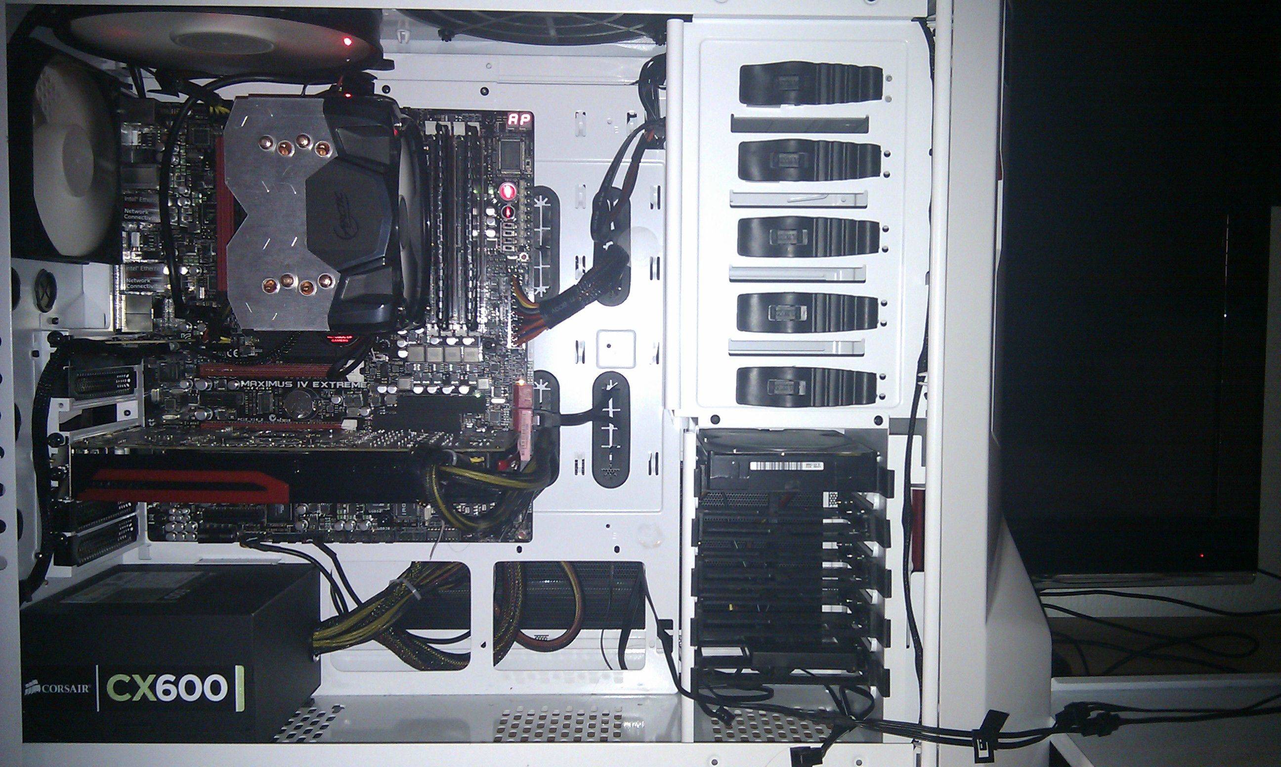 Specs: Case: NZXT Phantom (White/Red) Motherboard: Asus RoG Maximus IV Extreme (P67) PSU: Corsair CX600 Builder Series. CPU: i5 2500k @ 4.2Ghz CPU Cooler: Arctic Cooling Freezer i30 GPU: 3GB PowerColor Radeon HD 7950 (Ooooh yeah, baby.) RAM: Corsair Vengeance 2x4GB (Jet Black) HDD: 1TB WD Caviar Green SSD: 120GB OCZ Vertex 3 (Boot drive, duh.) Disk Drive: Who the hell cares? It’s a Sony something… Probably. KB: Sandstrom something, not actually that bad, considering it’s a cheap placeholder. Mouse: Acer mouse that came with my 5 year old PC.