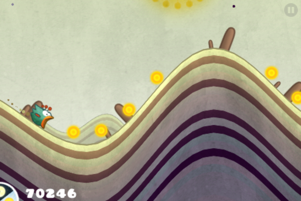 Where Tiny Wings really shines is its gameplay, which is deliciously simple, yet devilishly addictive. You’re a bird who has trouble flying because of your tiny wings, and your goal is to ski gracefully among the hills, trying to get as far as you can before the sunset ends your adventure. Touching the clouds and collecting little drops of sunlight will get you extra points, but the true show of skill is in the skiing itself. Three perfect slaloms launches the star bonus mode, where points rain down like candy for as long as your skiing remains flawless.