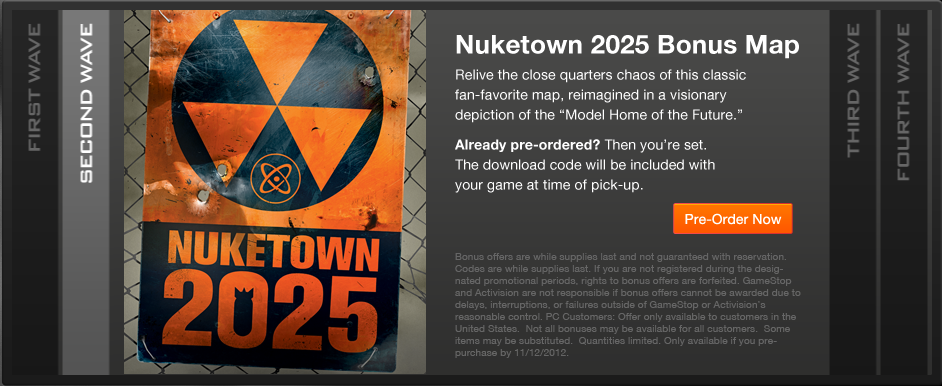 Black Ops II is right around the bend, and along with it, the now-typical pre-order bonus lunacy. In addition to retailer-specific bonuses, Activision has gone a step further this time around by forcing you to pre-order if you want to play the new iteration of the popular Black Ops map Nuketown. This goes past simply being a bonus–it amounts to you getting an incomplete version of the game if you don’t pre-order. Activision is holding content for ransom and punishing you if you choose to wait and make an informed purchase decision based on reviews and public opinion.