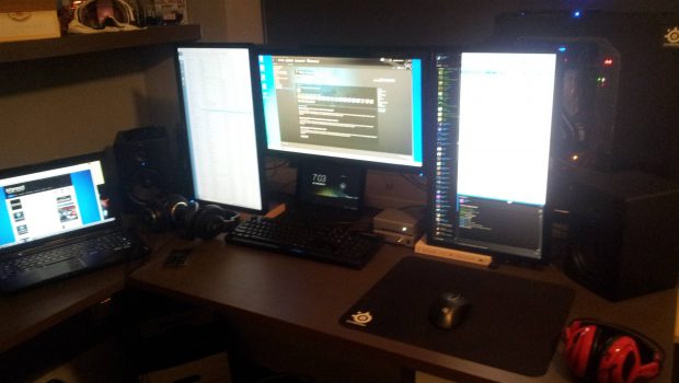 A shot of the full setup shows how sweet the new monitor stand really cleaned up my mess of a desk. All monitors are 23″ with the middle one being 120hz and the outside two just being crappy acer monitors. The computer is tucked in behind the screens along with all the cables and ugly stuff. I also just recently purchased the new Logitech G700s and couldn’t be happier.