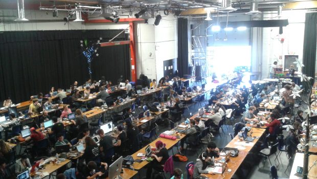 The official starting time was 6:00pm, and it was about 6:15 by the time I got there. Long rows of tables and chairs were placed in the “hangar” space of the Center for Digital Media in Vancouver. Some people came with pre-made groups, while others came alone. The organizers of the jam, Kimberly Voll and Andy Moore, said a few words and thanked the official sponsors, followed by an “ice breaker” activity where people still looking for teams were asked to organize themselves according to their skills. Programmers stood to the left, and everyone else stood to the right. People were encouraged to mingle, and eventually I formed a team with three handsome gentlemen: Joe, Stephen, and Chris.