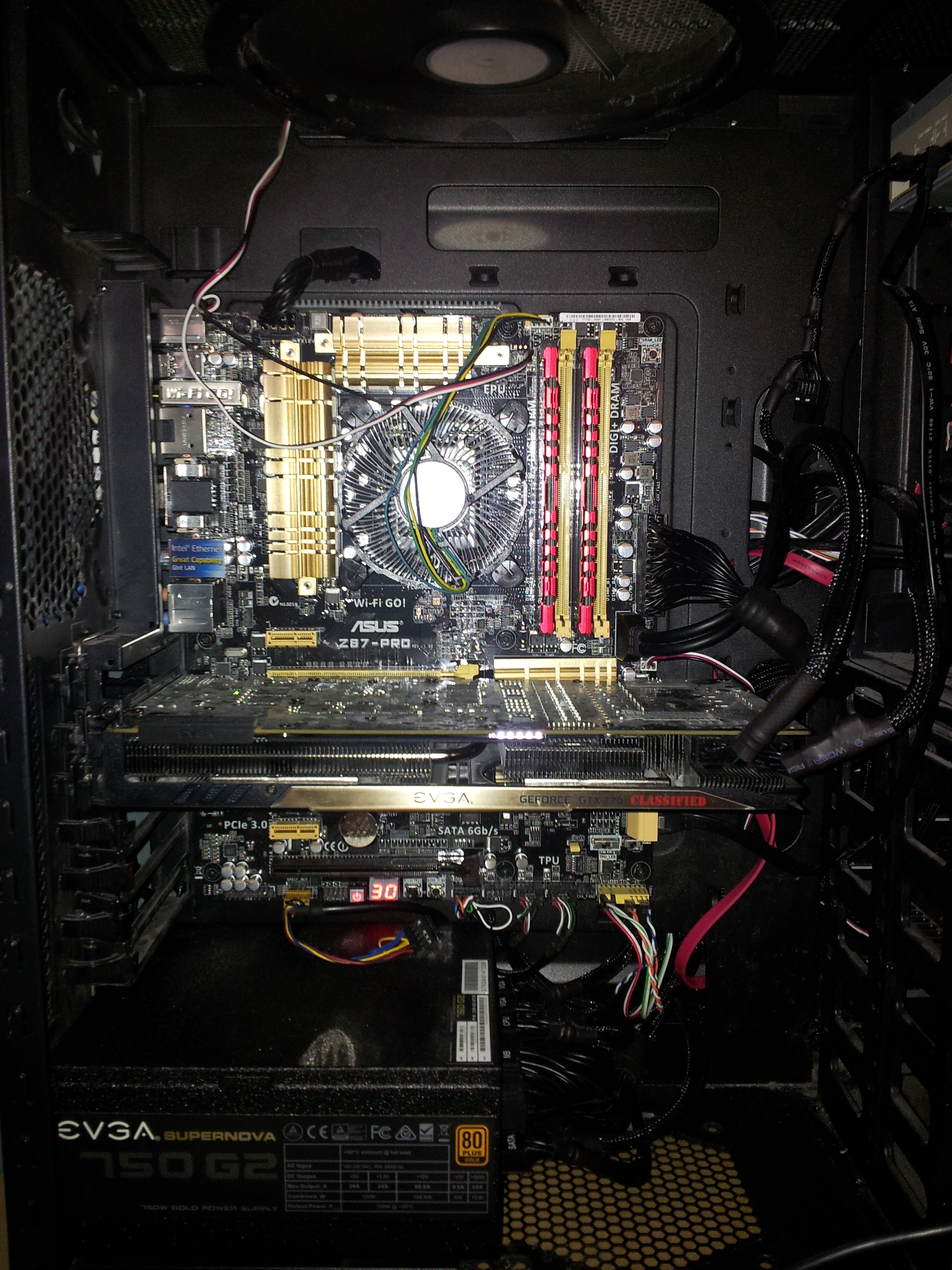 | Motherboard – Asus z87 Pro | Monitors – 27” Asus LED- 21” Samsung- 21” Samsung |