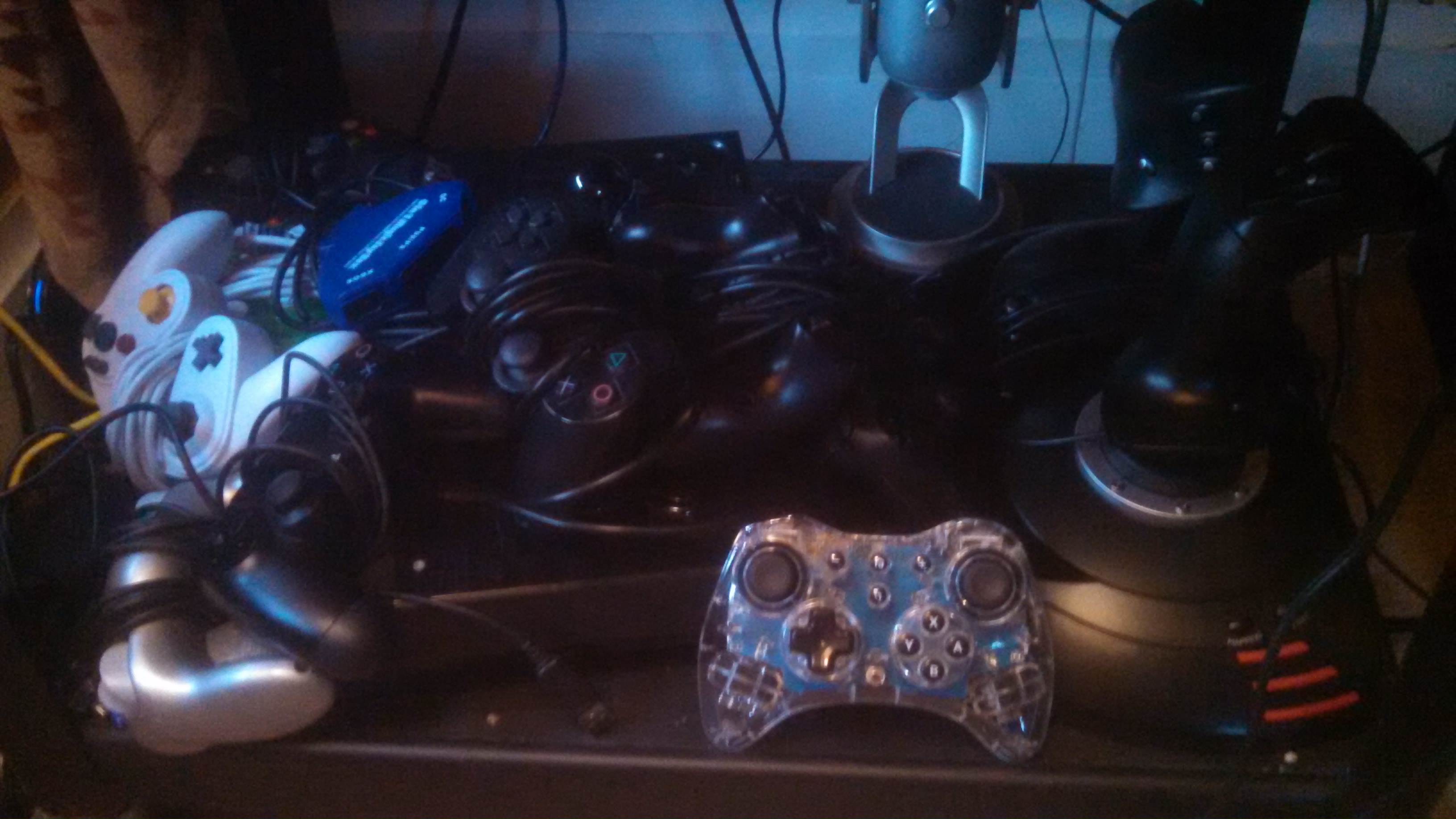 On the third and final shelf, I have a smorgasbord of various controllers, adapters, fight sticks, and flight sticks. There is even a Blue Yeti sitting in the back, there!