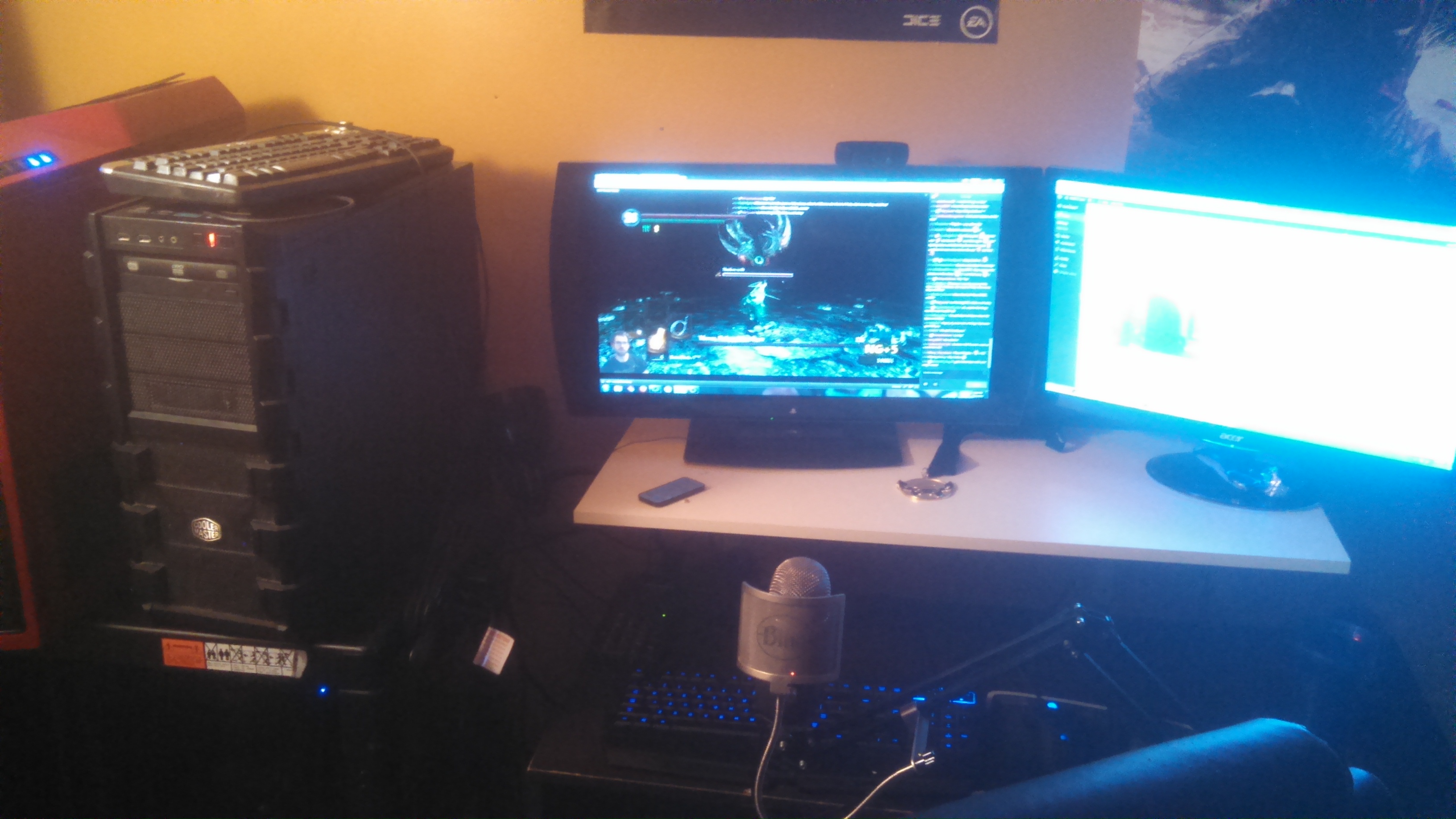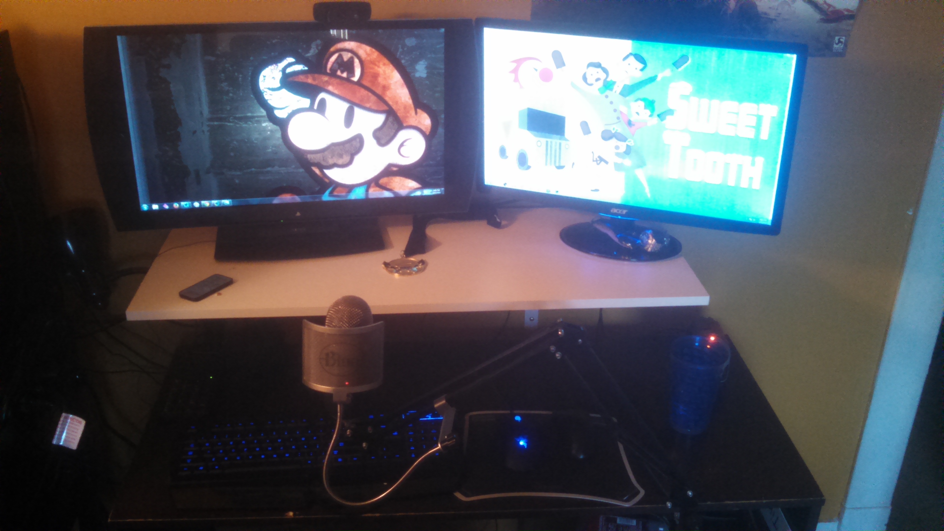 A 24″ Playstation TV and an 24″ Acer Idontknowthemodelnumberoops! Not the most ideal monitors, but I love the picture of the Playstation TV and the Acer gets the job done for reading chat or just browsing the internet. You can also see the webcam I use (Logitech c920), my Extra-Life Gold Medal, and my watches in this picture.