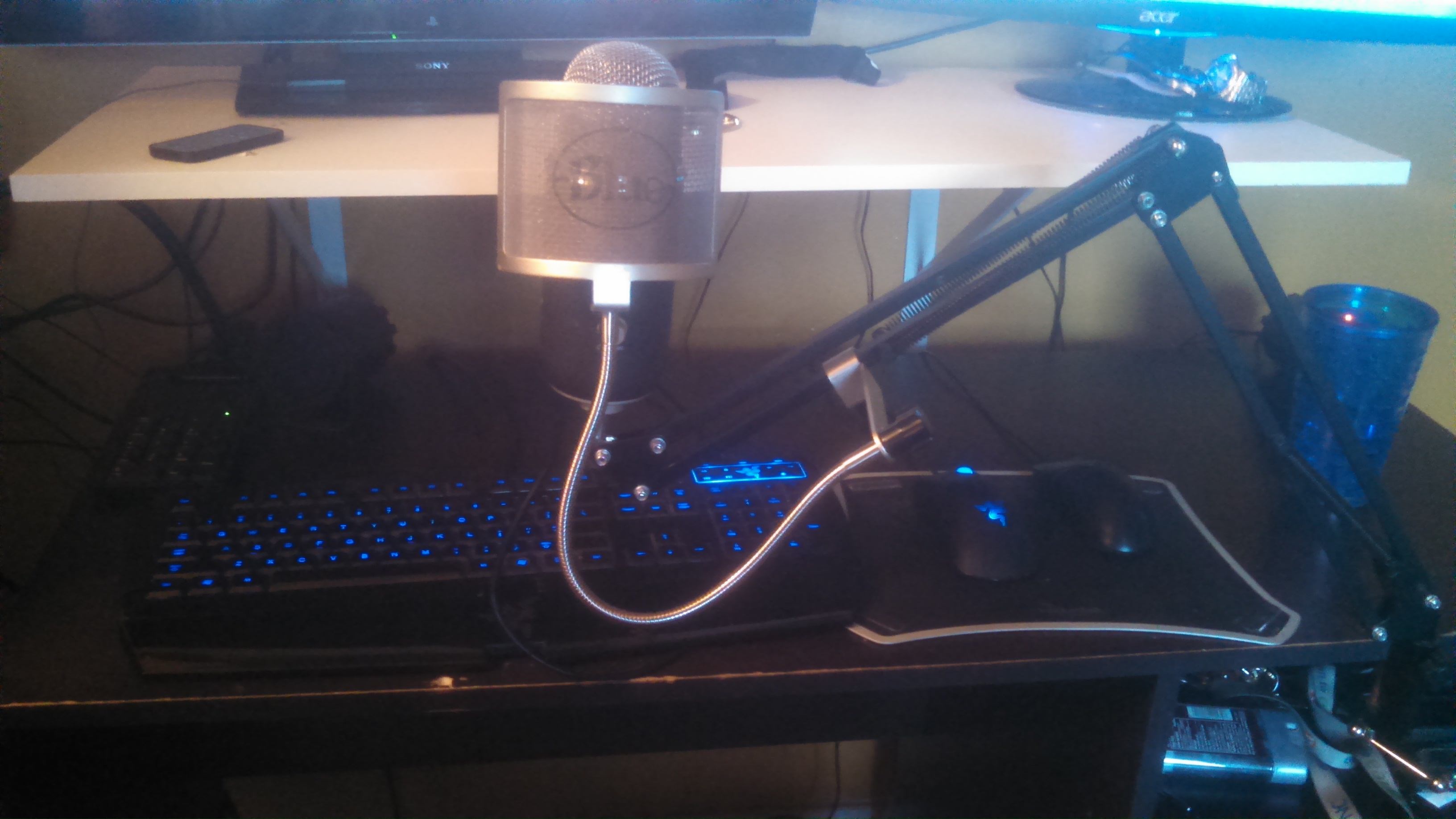 Also shown is my Blue Yeti Pro, attached to a $35 boom stand from Amazon. I will be upgrading to a Rode PSA-1 soon, though. The only other things you may spot are the deodorant to hold back the nerd sweat, an extra numpad for easy scenes changes, a second mouse for the streaming PC, $20 Walmart speakers, and a cup of water.