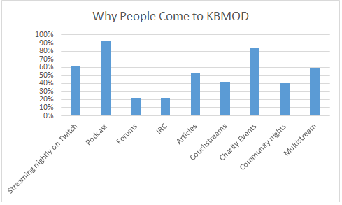 We believe KBMOD is different than your run-of-the-mill Twitch channel or gaming news outlet, and the wide range of reasons for you coming to KBMOD truly reflects that. As you can see below, the Podcast is, unsurprisingly, the most popular, but you also are a huge fan of participating in charity events. It was surprising, though, that there was less interest in the couch stream since they are related. KBMOD plans to keep doing the couch streams because we learn so much from them, and because they’re too much fun to give up. From them, we learn what works well and what doesn’t, which will ultimately improve the quality of the Extra-Life LAN event.