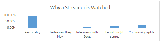 Between the lower scores and the feedback for the streamers you don’t watch, we came to the obvious conclusion that the other streamers should be on the Podcast! We’re geniuses! To be honest, we didn’t come up with the idea completely on our own, since a number of you suggested that or at least said that you had no idea whom those other streamers are. Between that and your responses regarding why you watch a streamer, it’s clearly pretty important to know the person if you’re going to invest your time into watching them.