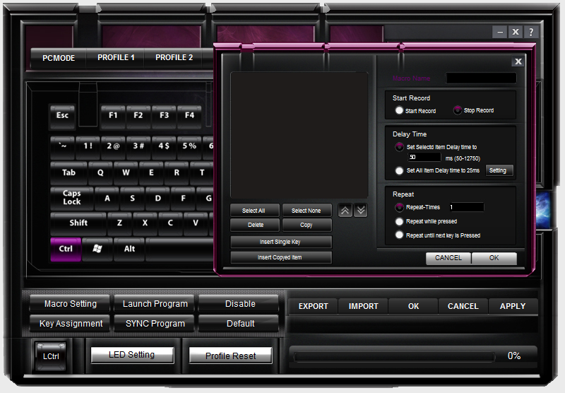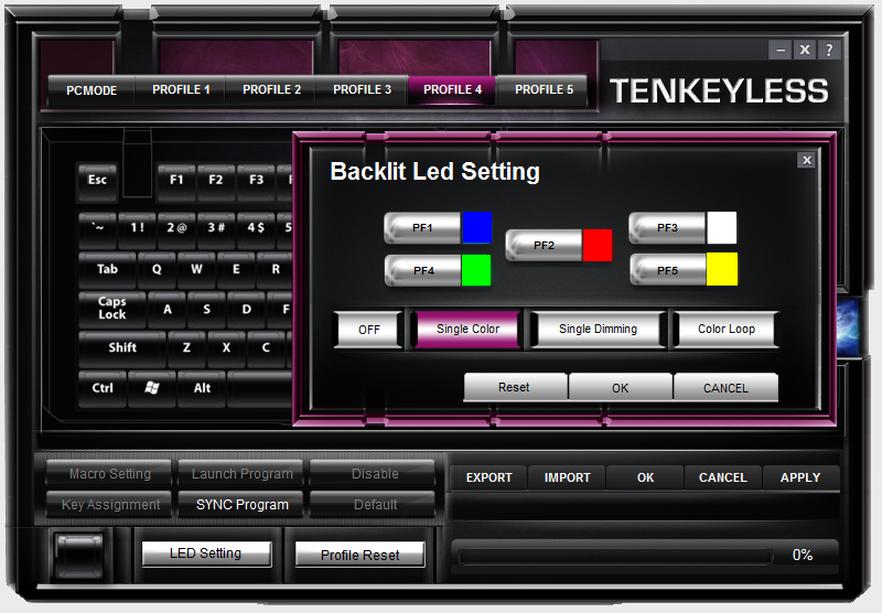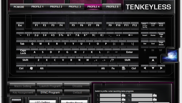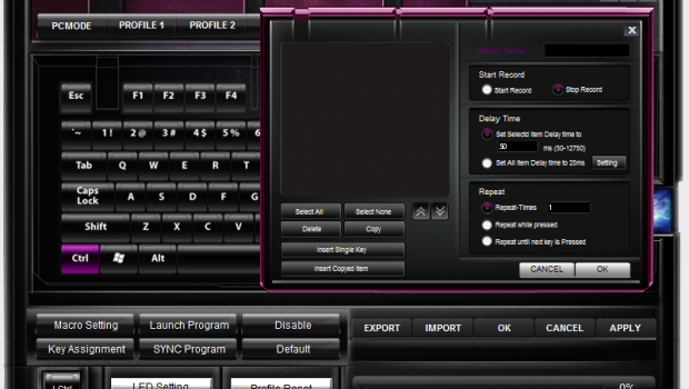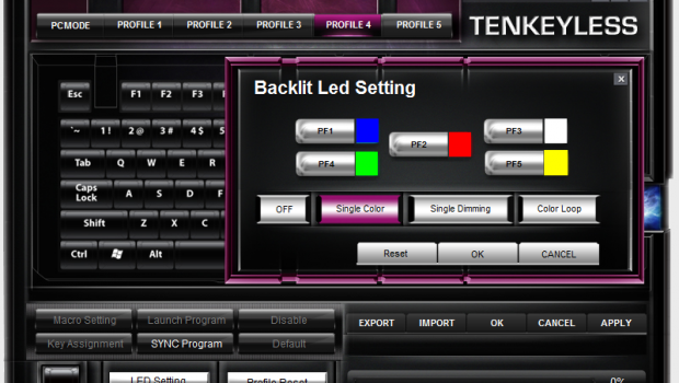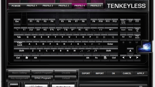 Issues experienced in the current version of the software aside, it’s still fairly versatile for day to day use. You have the capability to define 5 profiles, which can be set on the fly by holding the function key, and pressing F8 through F12. In each profile, you’re able to set macros, reassign keys in a custom manner (for example those who might use a DVORAK layout), and set hotkeys for program launch. You’re also able to set the profiles to sync to specific programs, once you launch them. Thankfully, you’re able to export and import these profiles so that you don’t have to do all of that heavy lifting more than once.