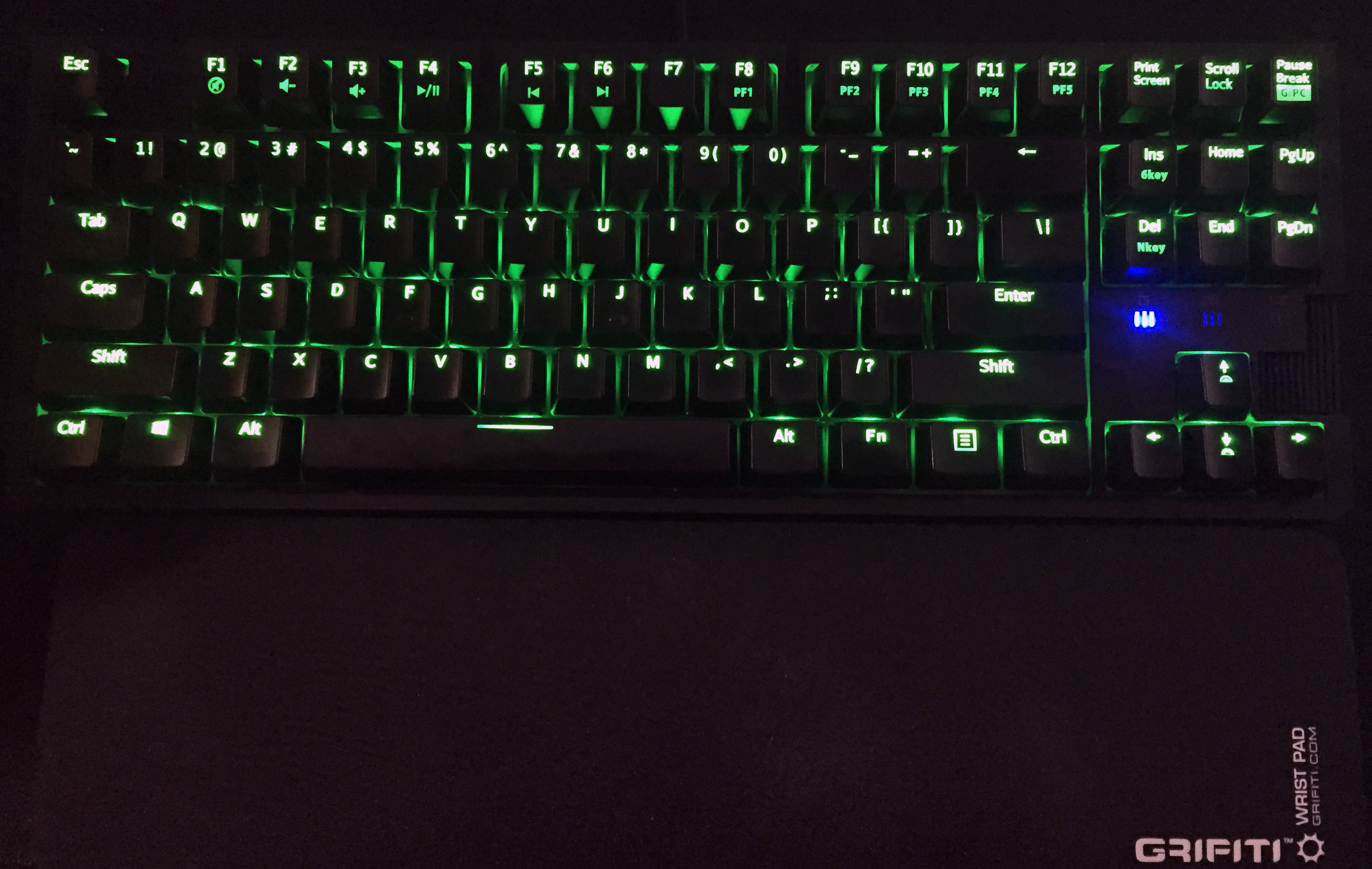 Interestingly, the Windows key is disabled entirely in the 5 gaming profiles, and in order to enable it, you must toggle to “PC Mode” with Fn+Pause/Break. In this mode, the LEDs change to purple, and the Windows key is available for macro as well as other built-in windows functionality (Win+R to run for example).