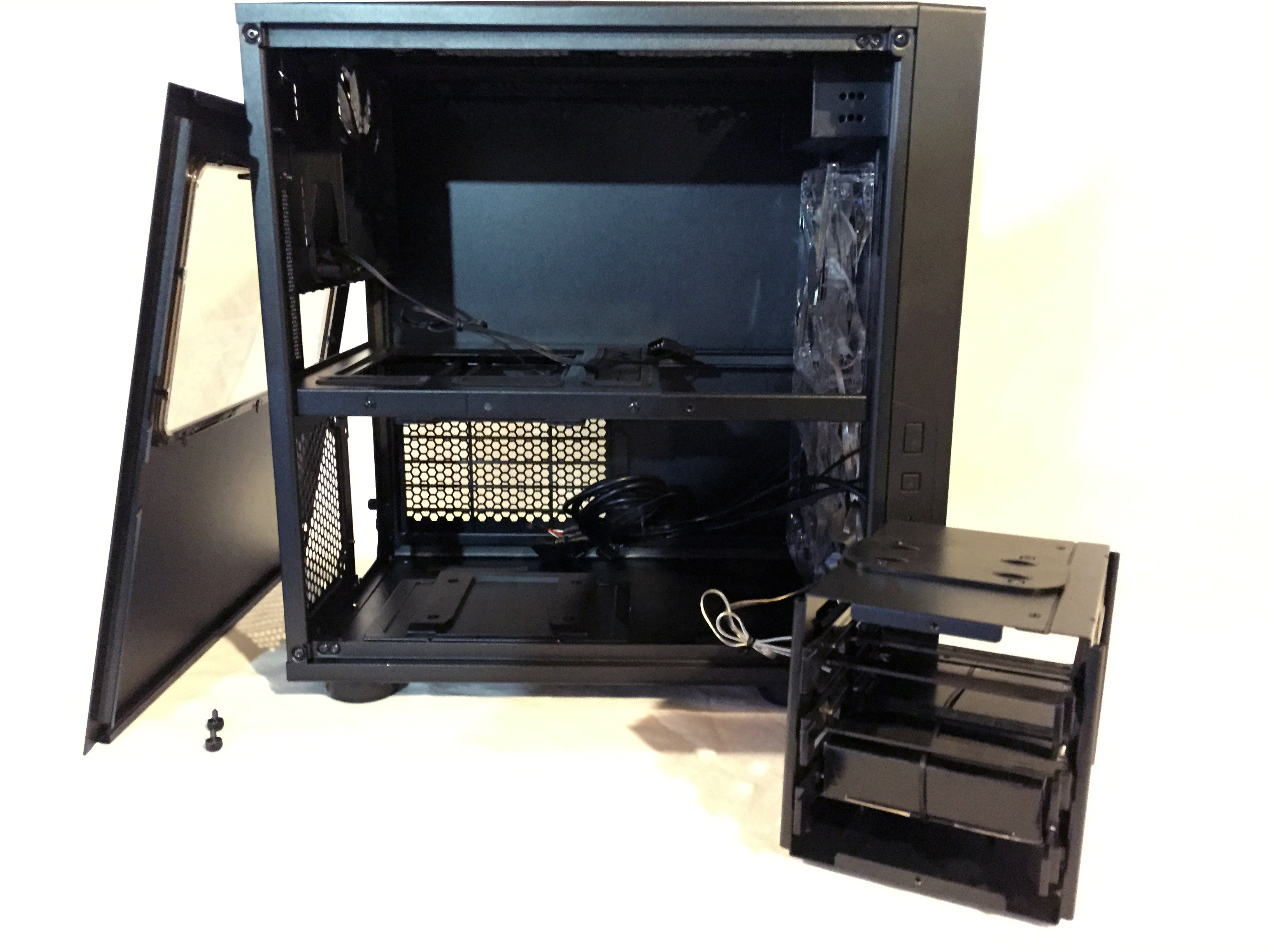 Right off the bat, I’m thankful for thumbscrews. I wish they were captive (lost one, found it an hour later!), but they’re certainly better than having to reach for a screw driver to remove them. Popping off the side panel reveals the removable(!) motherboard tray, and removable HDD/SSD cage below. There really isn’t any explicit cable management trays or paths here, but it’s rather clean inside.