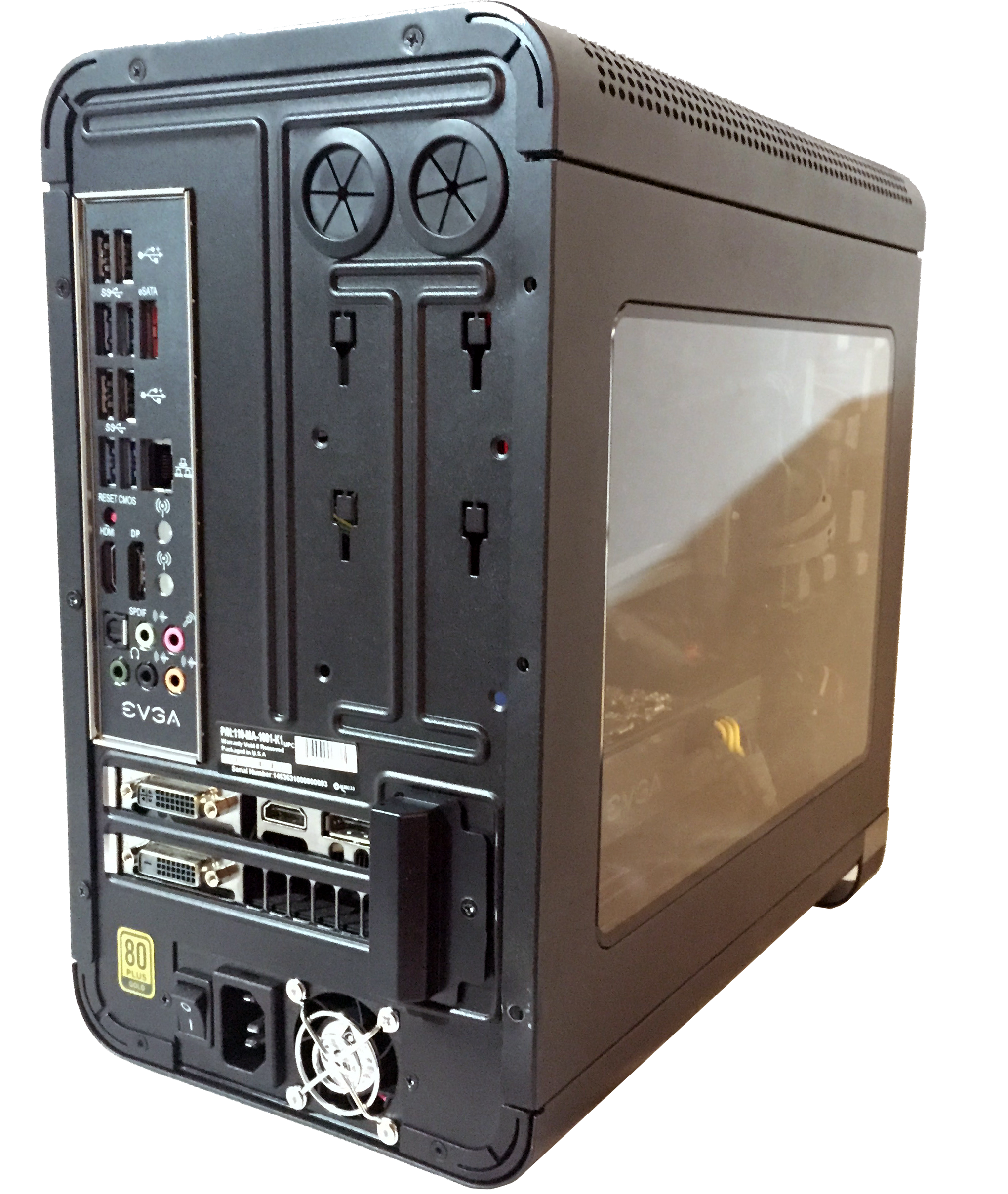 The exterior is dominated by black SECC steel, a large acrylic side window, as well as a mirror finish black acrylic front panel. At the center you’ll find a silver EVGA logo, and a single power button. On the right hand side, EVGA has made two USB 3.0 ports, a headphone jack and microphone jack accessible, a slot above for the optional slot-load slim optical drive, and a vent positioned low close to where the GPU will sit. The top of the case is dominated by perforated steel that gives the case a really pleasing aesthetic.