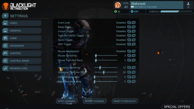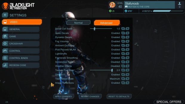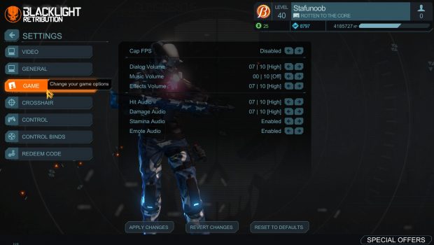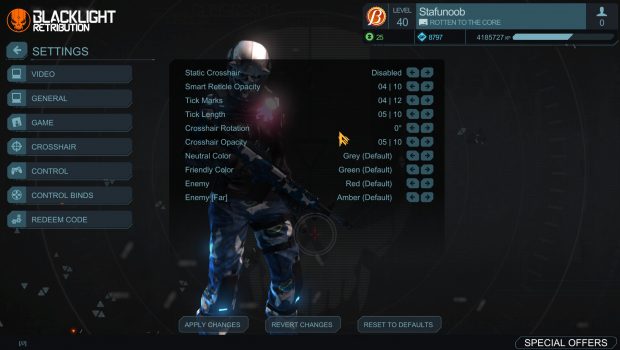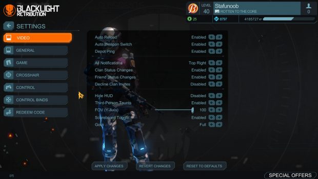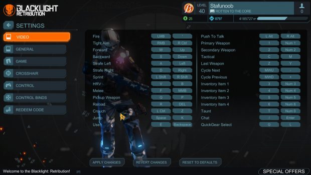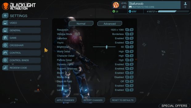 When first loading up Blacklight: Retribution you are met with immediate change. Everything has gotten…bigger. All the menus are blown up so even those with failing eyesight can read the text. This is obviously the first sign of all the files being copied directly from PS4 where most players are playing more than 2 feet away from their monitors or TVs. With a plethora of settings to go through, turning the menu sizes down is unfortunately not one of them at the moment. A wide array of options however are still available for everyone to optimize the game to their liking.