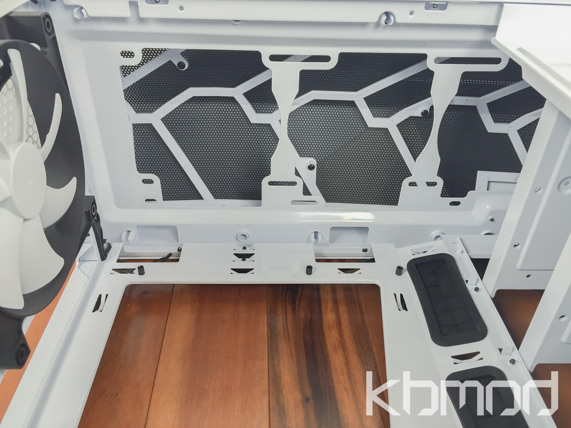 The floating interlocking ventilation panels aren’t just for show, though they are striking – they provide plenty of airflow in, and allow heat to escape the roof rather quickly. The intake at the front includes a magnetic mesh air filter, and there is also a mesh air filter at the bottom of the case for the power supply intake. The feet at the bottom of the case are substantial enough to raise it off of carpet if necessary, but this is the type of case you want to show off, rather than hide under a desk.