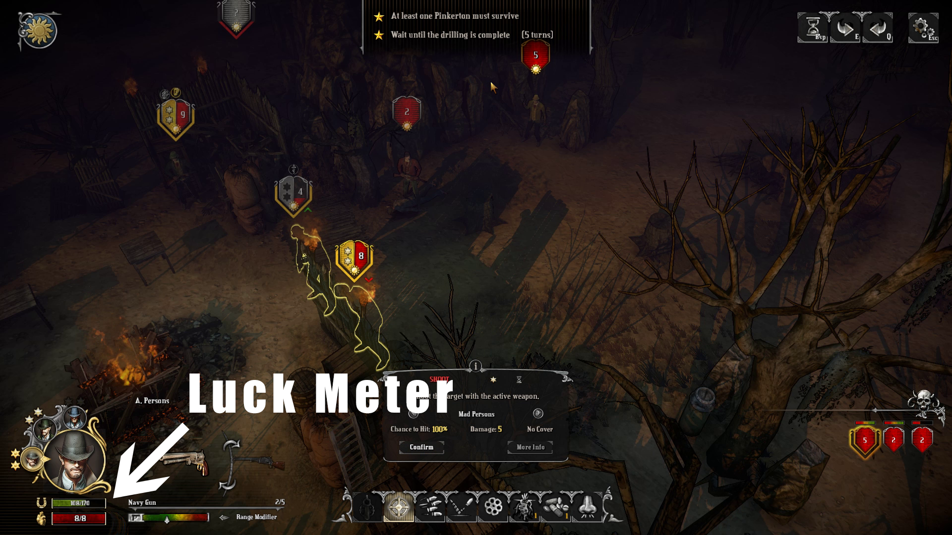 There is a very interesting mechanic built into this game called “luck” that brings a certain dynamic to the strategy of the game. How luck works is the higher a character’s luck is the less chance there is for them to be hit by a bullet. Subsequently, the lower a character’s luck the higher chance there is for them to be hit. This at least gives players a feeling of their fate not being completely decided by RNG unlike when playing a certain X-COM game. Luck can fluctuate one of three ways; your character being hit raises it, if a bullet is shot and missed your luck gets lowered, and your character can also lose luck by using special abilities provided to your characters. While a lot of these abilities are powerful and extremely helpful, they do cost quite a bit of luck to use leaving your character at a huge risk of getting hit by the enemy.