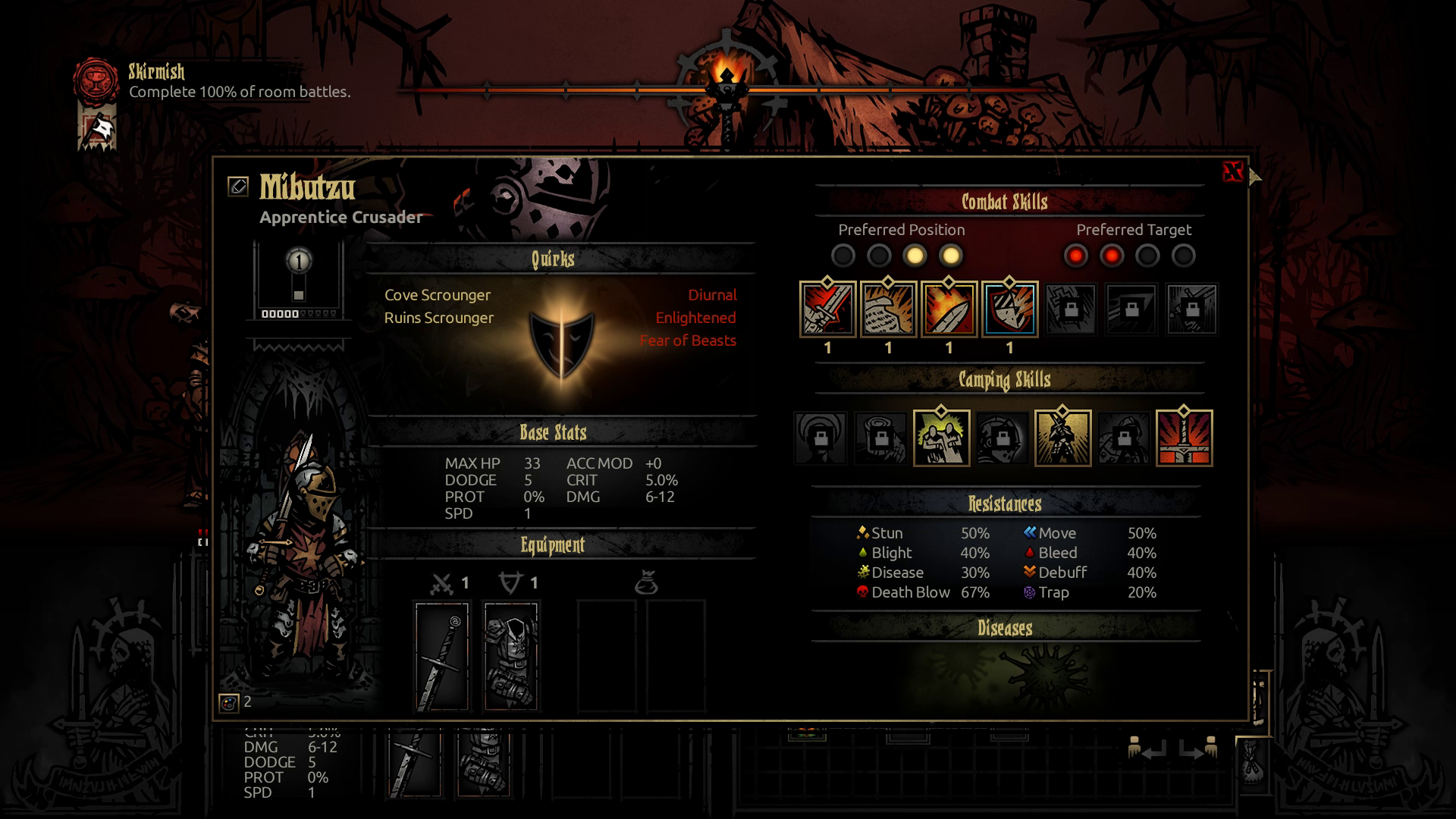 In town, players can use treasure gathered from their mentally challenging adventures to help prepare themselves for future successes in the depths. Your decisions here can make or break your entire save file. For example, if you send all your healers to de-stress at the same time, you are left with no one to keep your team alive during your next mission. Choosing what heroes you recruit from the Stage Coach is also key. You may love everything about the Bounty Hunter class, but a full team of bounty hunters will get you past maybe 2 rooms before you’re having a bad time. Upgrading heroes’ armor, skills, and treating their debilitating quirks are all done in the estate, and are necessary if you hope to have any chance of survival.