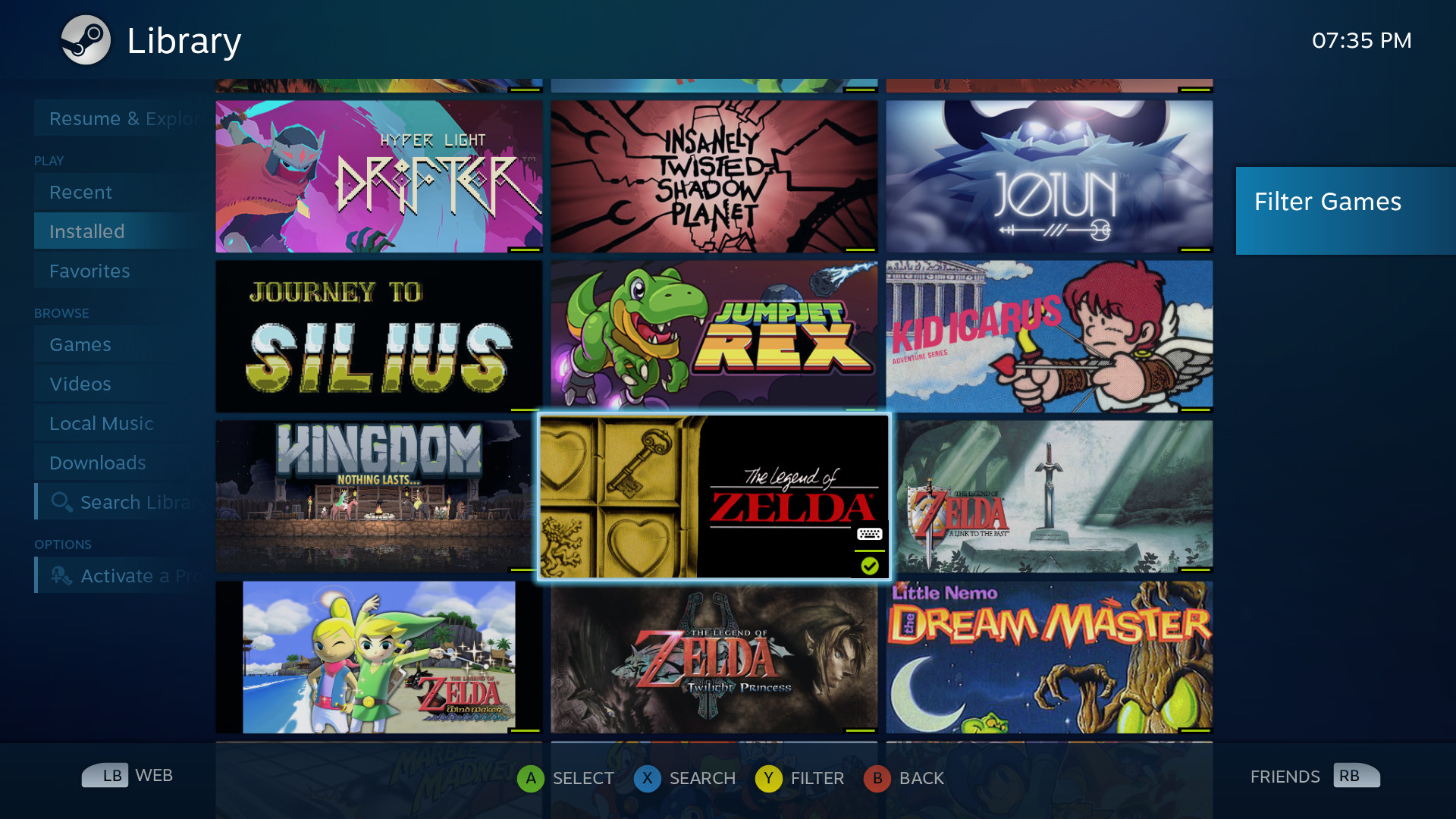 After organizing a subset of my rom collection, I ran Ice one more time, confirmed that it detected the roms I’d placed in the appropriate folders, and started Steam back up. Upon returning to the Big Picture interface, I was pleasantly surprised to see that those games Ice detected were added to my library! Not only that, they ran without any trouble! (If you’ve messed with emulators before, especially on Linux, you might be able to understand my surprise.)