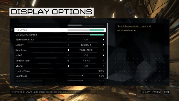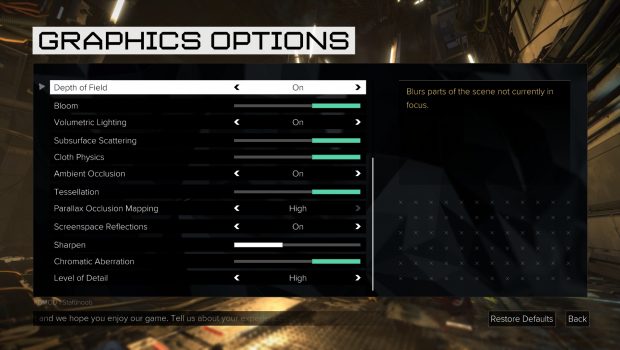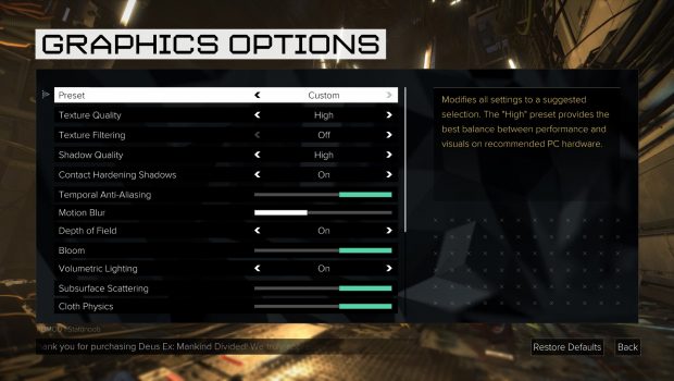 Let’s just get what everyone is talking about out of the way first, and that is the performance of Mankind Divided. The options can all be changed in the launcher of the game, and I was defaulted to the “High” preset. I am reviewing the game on SLI GTX 970s, an i7-4770k, and 16gb of RAM, so just for kicks I decided to try out the “Very High” preset just to see how my system would fair. Sadly, an average of 7 FPS meant that dream was short lived. After about 45 minutes of messing around with various graphics settings, disabling/re-enabling/disabling SLI for a second time, and unfortunately rolling back my graphics drivers I finally found an optimal spot where I didn’t sacrifice too much visual quality but still got an acceptable frame rate.