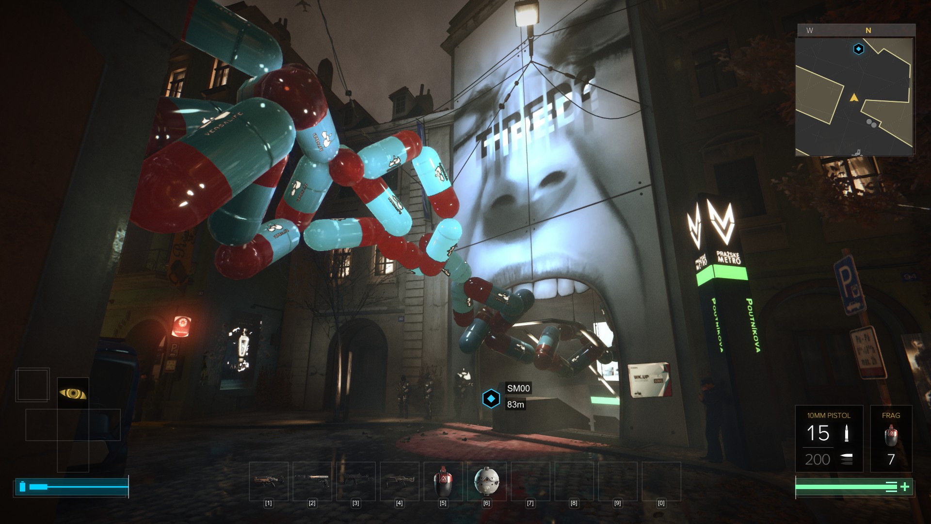 Prague is the one and only major city hub that Mankind Divided takes place in. One of my favorite parts of the Deus Ex franchise was flying around to different countries, exploring cyberpunk cities modeled after the culture of each country. Naturally, I was apprehensive to find out most of my playtime would be spent exploring only one city. Thankfully, with most of the focus being spent on one city, the amount of detail packed into it is incredible, with a wide range of lifestyles put on display depending on the neighborhood you find yourself in. The neighborhood where augmented humans are forced to live oddly enough has an increased police presence and security checkpoints in place, showing players first hand just how anti-aug Prague really is.