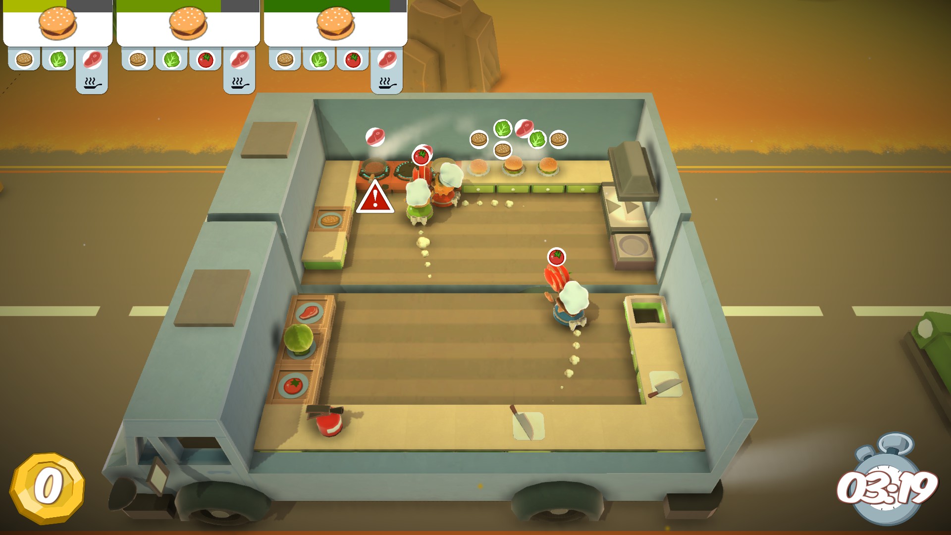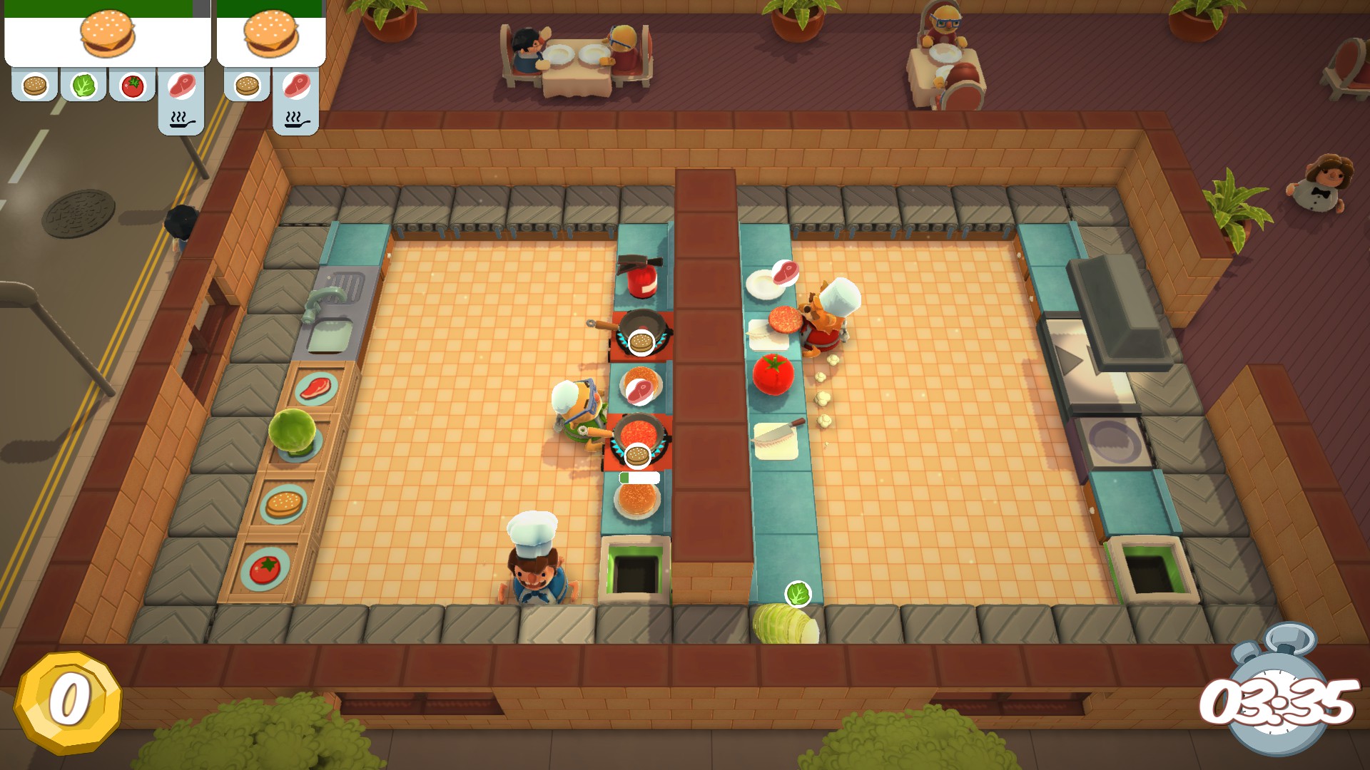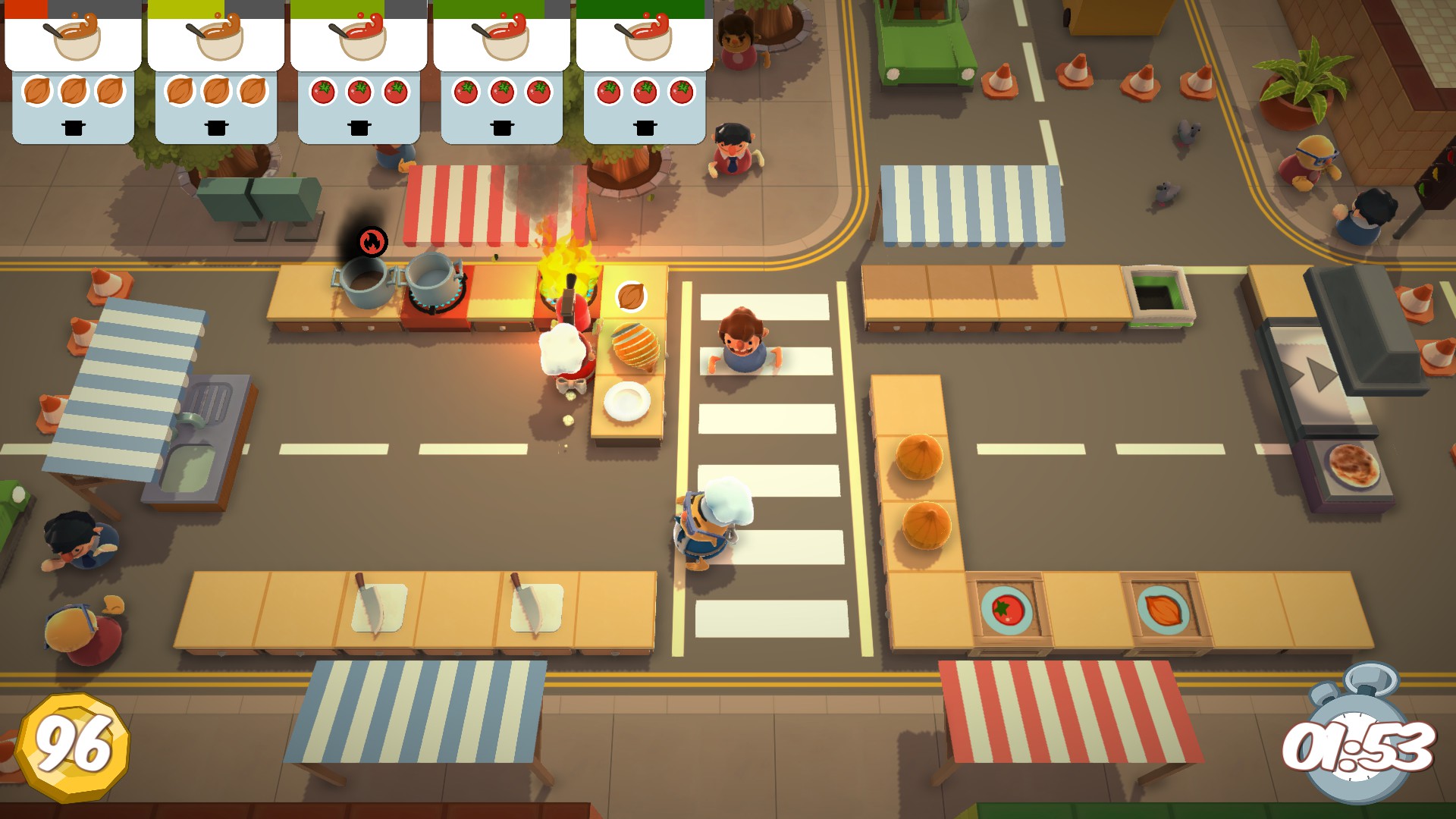 When I received the game, I attempted to play Overcooked on my own before inviting others to play with me. When jumping into the campaign with no other players, you are given two chefs to control. While this does help with your productivity to some degree, it’s still difficult given that you are only able to move one chef at a time. Even though you can freely switch between chefs with a press of a button, I still found that a majority of time one would be just standing there while I try to get the other to its next task. Having one or more other players helps significantly, since each player is only responsible for one chef. Do note that this causes the coins required for the star rating to scale up as it is based on how many players are in the game. There also comes a new kind of difficulty in that everyone must coordinate their cooking tasks and communicate with one another so that issues won’t arise when making a dish that’s been ordered. Bear in mind that Overcooked only offers local multiplayer – no online play. I believe that this is the kind of game that you should be playing on a couch with your friends instead of communicating via a headset in an already chaotic game environment. However, if anyone wanted to play with a friend that is too far away to invite to their home they unfortunately don’t have that option.