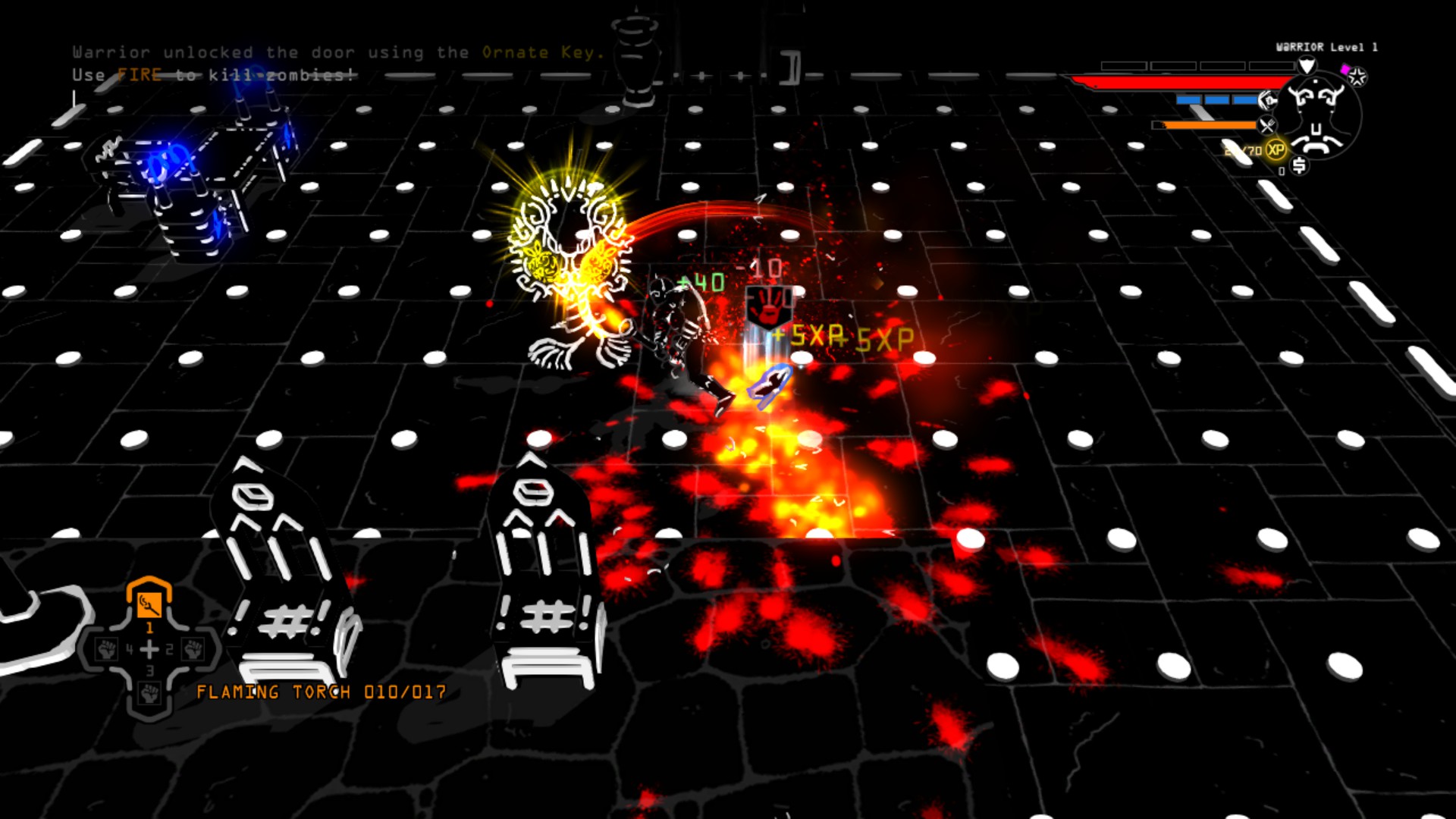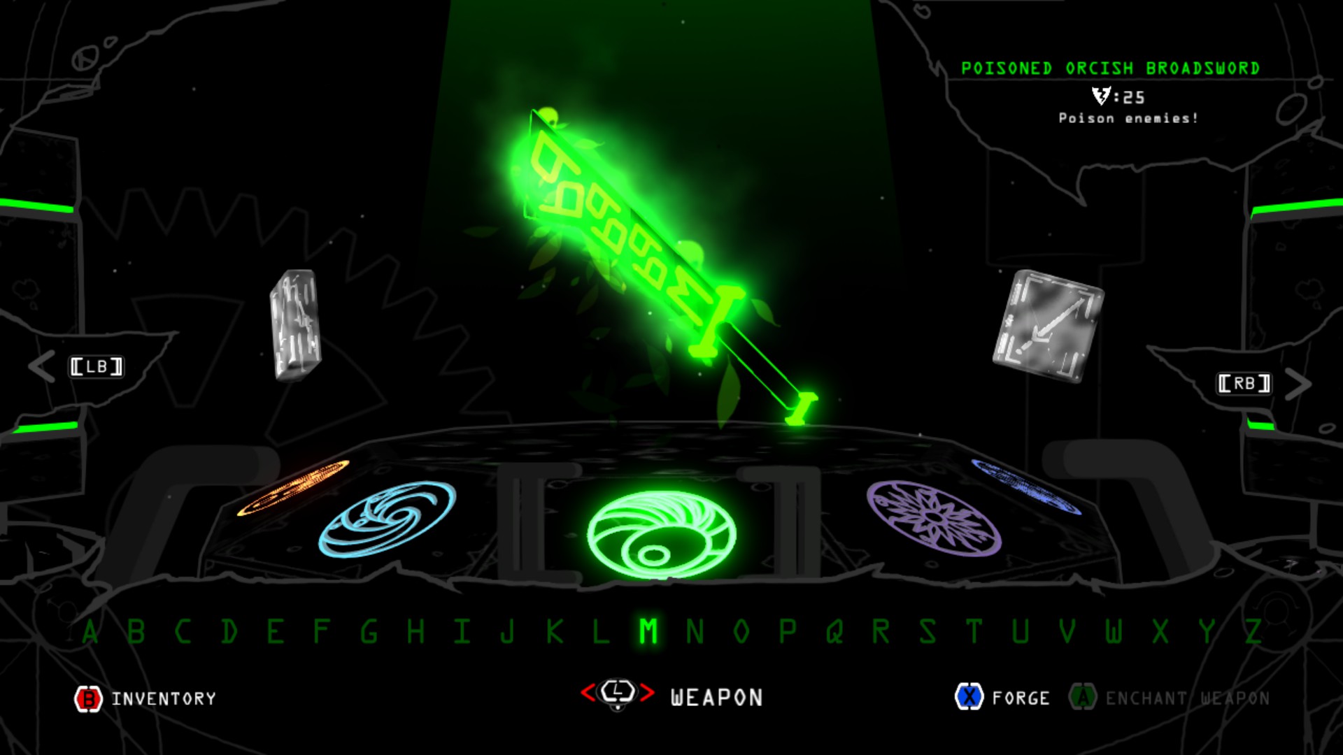 Aside from being the key element in the cosmetic design of the game, the text also plays a crucial role in how each character is able to craft and upgrade their weapons. As you proceed through the dungeon, you will come across standard letters from the alphabet in various colors. White letters are necessary for crafting new weapons while letters that are red, green, light blue, dark blue, or purple are used to enchant your weapons with one of five elements. Enchanting your weapon will not only increase its damage output against monsters of the opposite element, but will also allow you to bypass doors that are locked by the same element.
